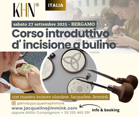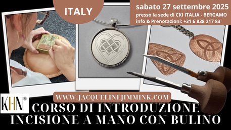 Vorrei invitarti ad una dimostrazione e un corso unici e autentici sull'incisione a mano con bulino. Maestra incisore Jacqueline Jimmink (Paesi Bassi) è in Italia per tenere alcune dimostrazioni esclusive e un corso dal titolo "Incidi il tuo ciondolo in argento".